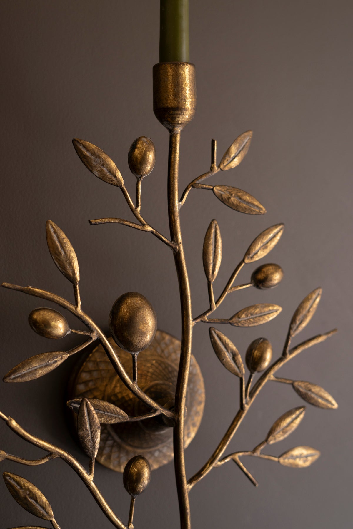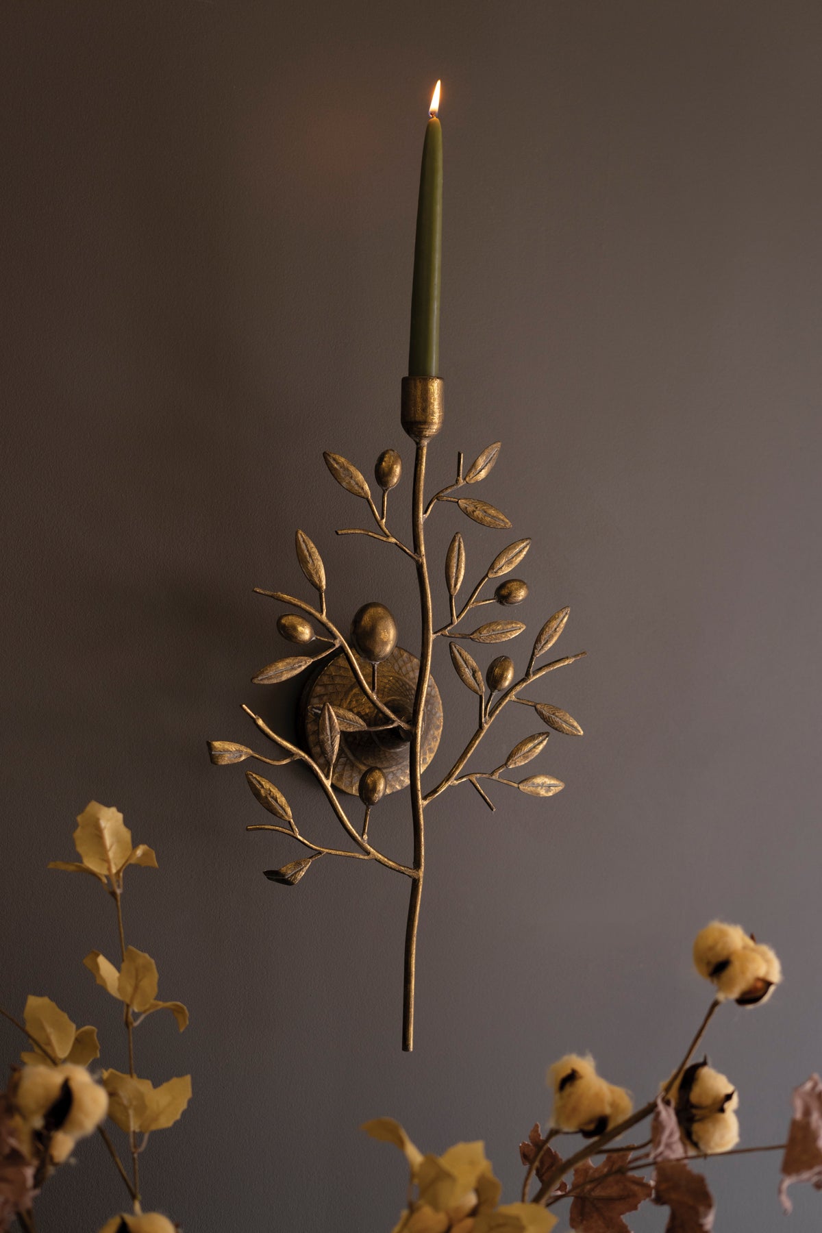 This fruit tree wall sconce brings gentle elegance to your walls. The sculpted branches hold a single taper candle, creating a warm glow framed by antique brass detailing. A beautiful way to add depth and character to hallways or intimate corners. Two keyhole hangers.