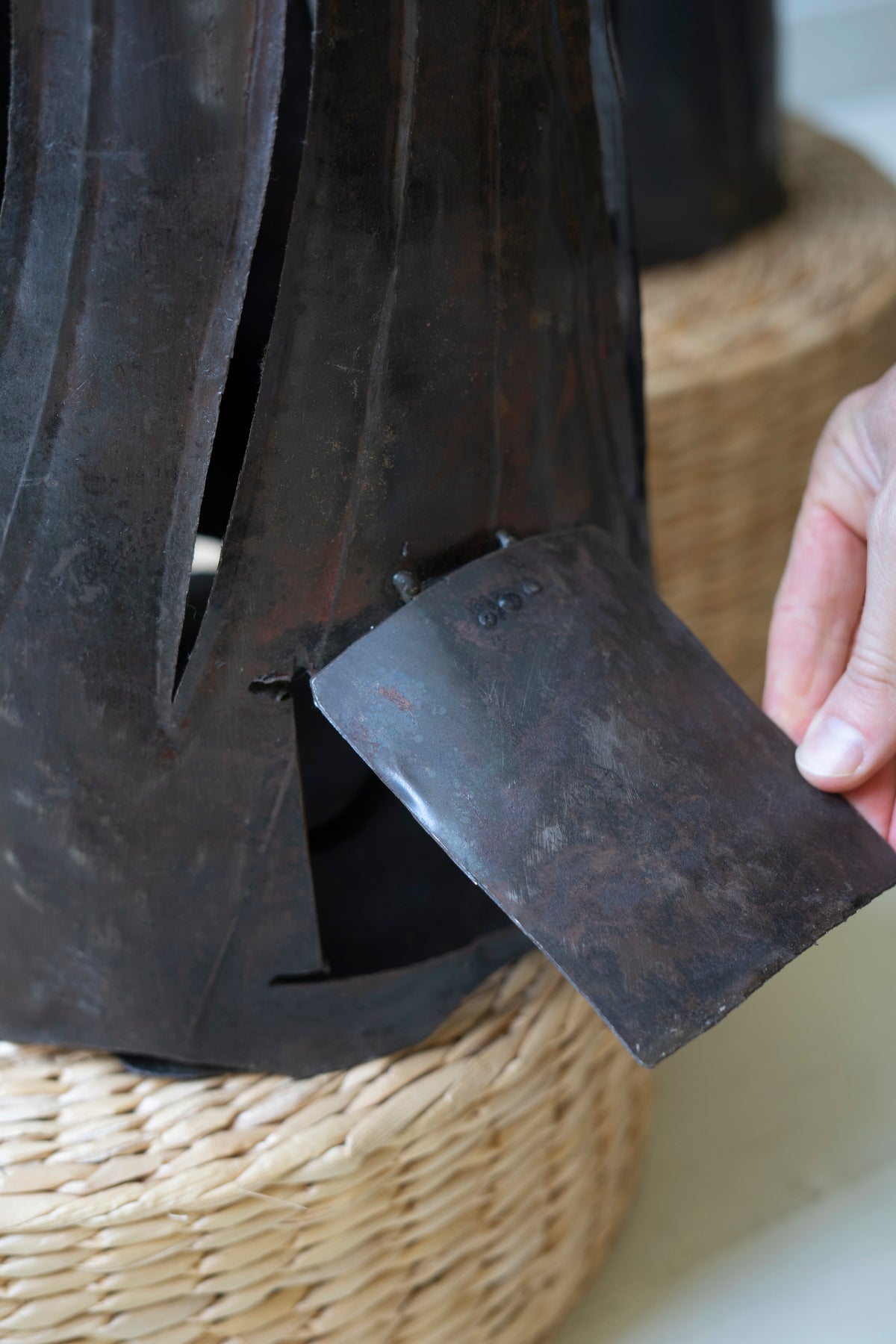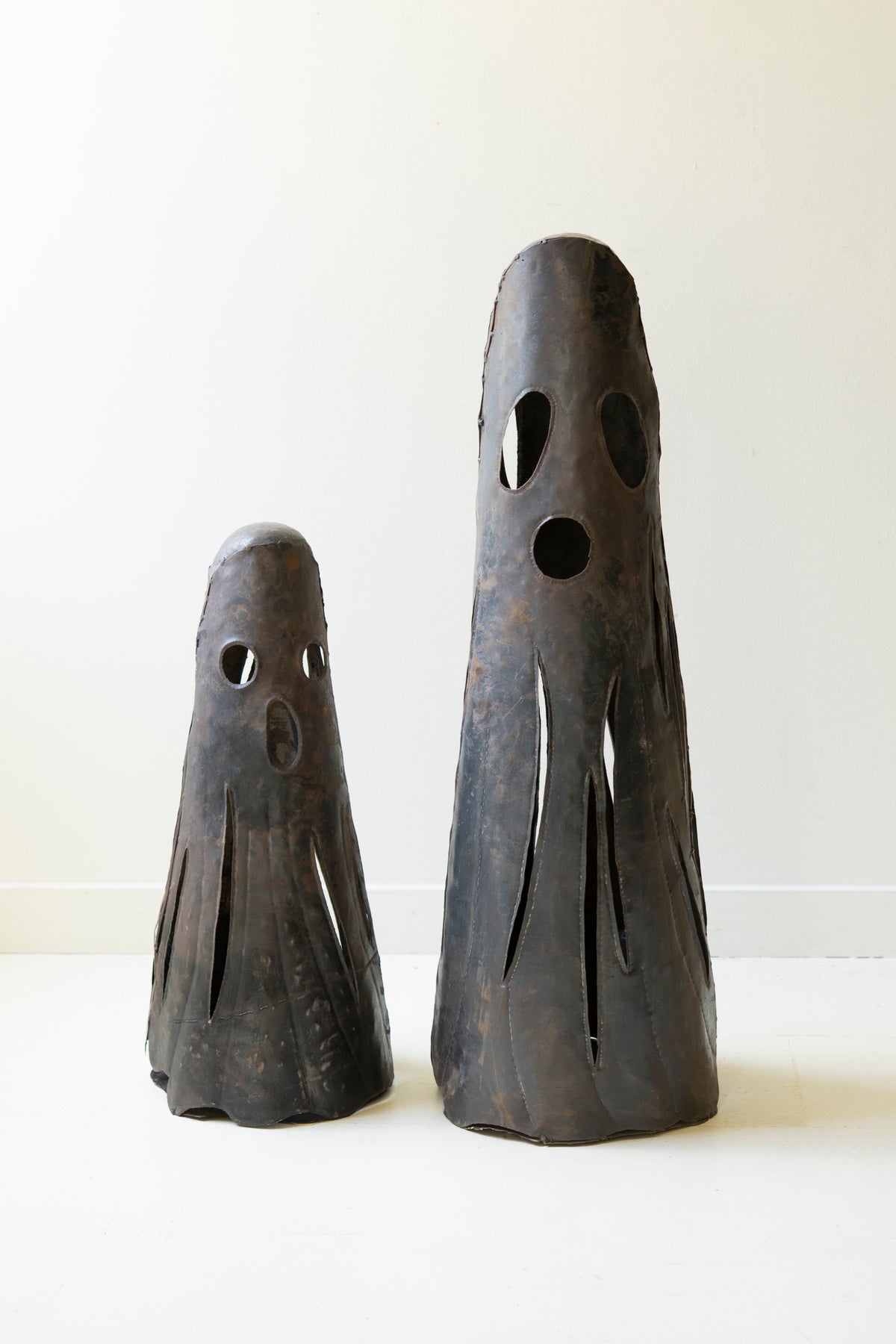 These rustic iron ghost luminaries bring a playful — yet artfully weathered — touch to seasonal décor. Each ghost features a charming cut-out face and a naturally distressed finish that glows beautifully when lit from within. Display the pair together for height variation and a spirited Halloween vignette with artisan personality. Set includes 2 pieces. One each size.
