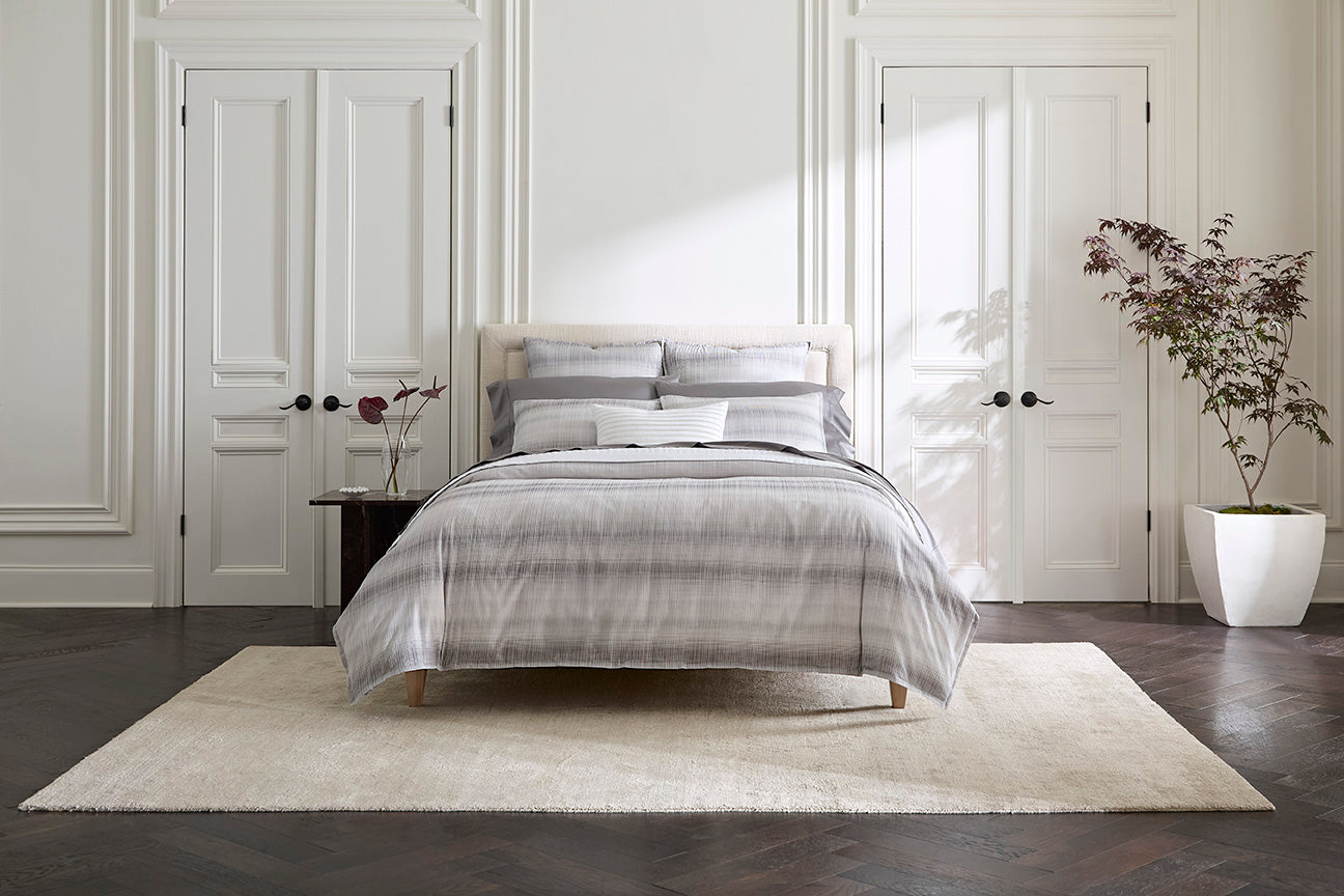 There’s a quiet poetry to Perugia. Its woven lines ripple like shadows at dusk, capturing the fleeting beauty of light in motion. Made in Italy from pure long-staple cotton, the sateen jacquard offers a soft luster and depth that feels both timeless and modern. Available in a hushed lunar tone and finished with tailored mini-flanges that frame the piece.