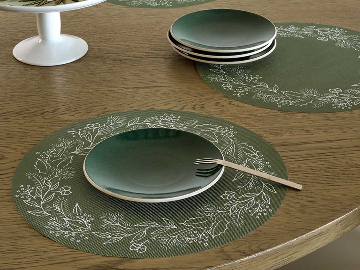Developed in collaboration with Martha Stewart, Wreath is a modern holiday classic. This spirited yet sophisticated placemat combines the precision of digital printing with a sleek, ultra-durable woven textile that wipes clean. The botanical border, complete with pine boughs and sprigs of holly, originated as hand-drawn artwork in our New York design studio and encircles whatever is placed at the center.