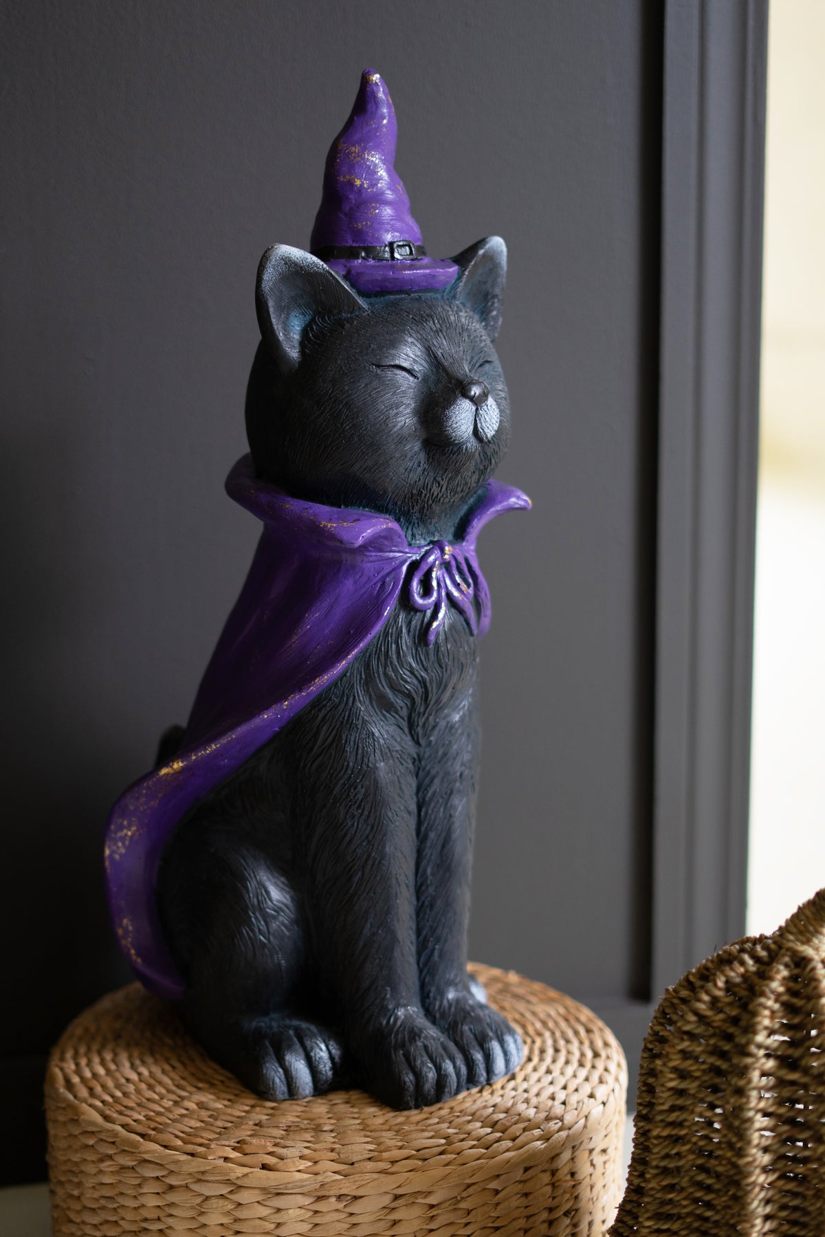 Here kitty kitty! This painted resin black cat with a purple hat and cape is must-have decor for Halloween. Greet your trick-or-treaters with this special Halloween cat.