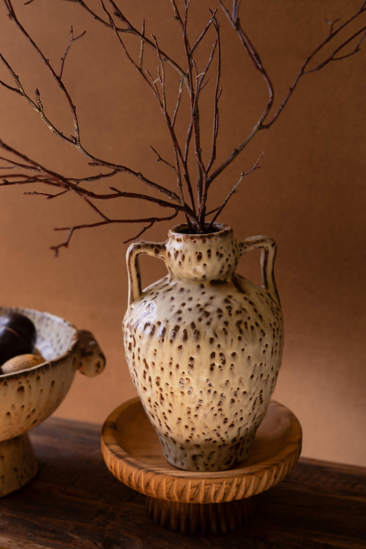 Add a classy touch to the hunting camp with this rustic urn with two handles. Fill it with fronds for an interesting centerpiece or use it in the office. The speckled appearance makes it a great fit anywhere you need a rustic touch.