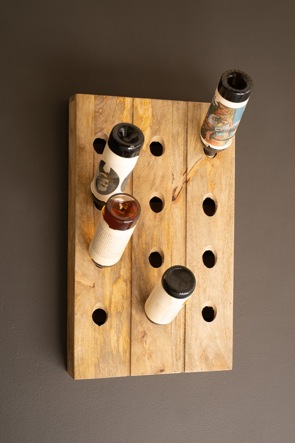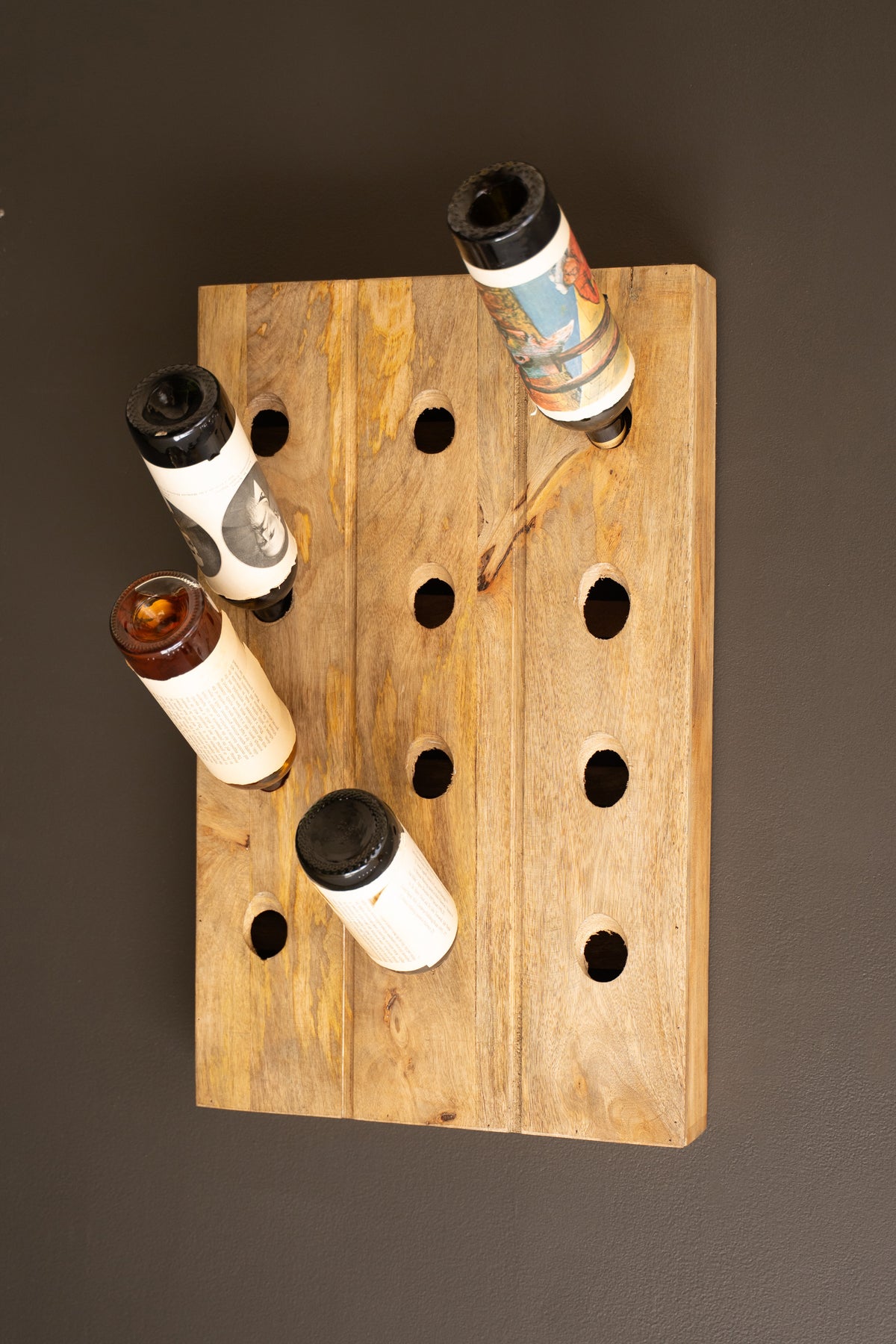 Store up to 12 bottles in this unique wine rack. This wooden wall wine rack is made in India and stands 26" tall. It is made of unfinished wood and hangs on two sawtooth hangers.
