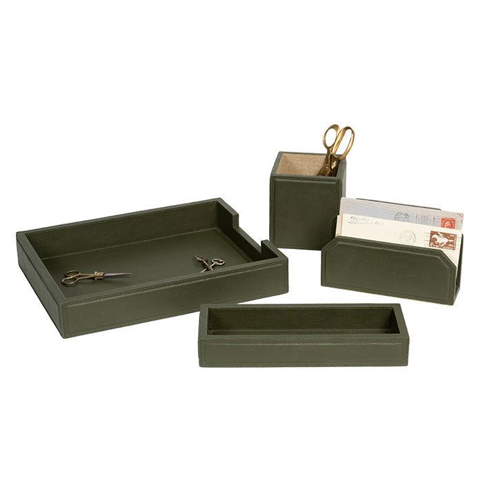 Stylize a study or elevate the details of a desk! Raised full-grain leather in a soft, versatile light gray makes our Asby a refined collection for any client.