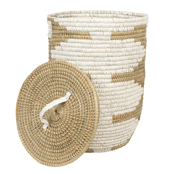 Round hamper with symmetrical white design on natural mendong and raffia.