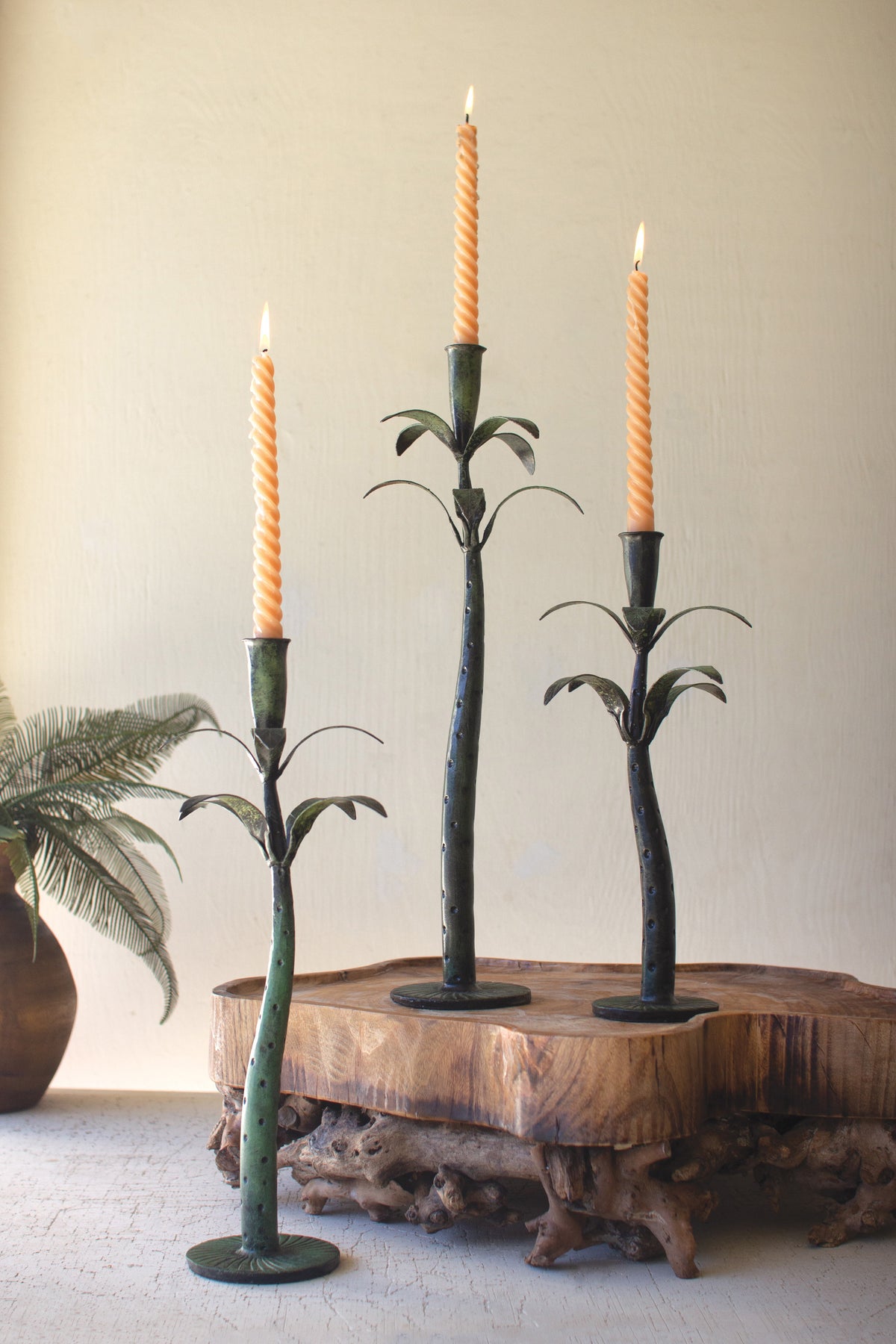 Place this set of three iron palms on your tropical table or mantle. These hold one taper candle each. The set contains three pieces with felt bottoms, one in each size. Taper candles not included (LED candles recommended. Never leave a burning candle unattended).