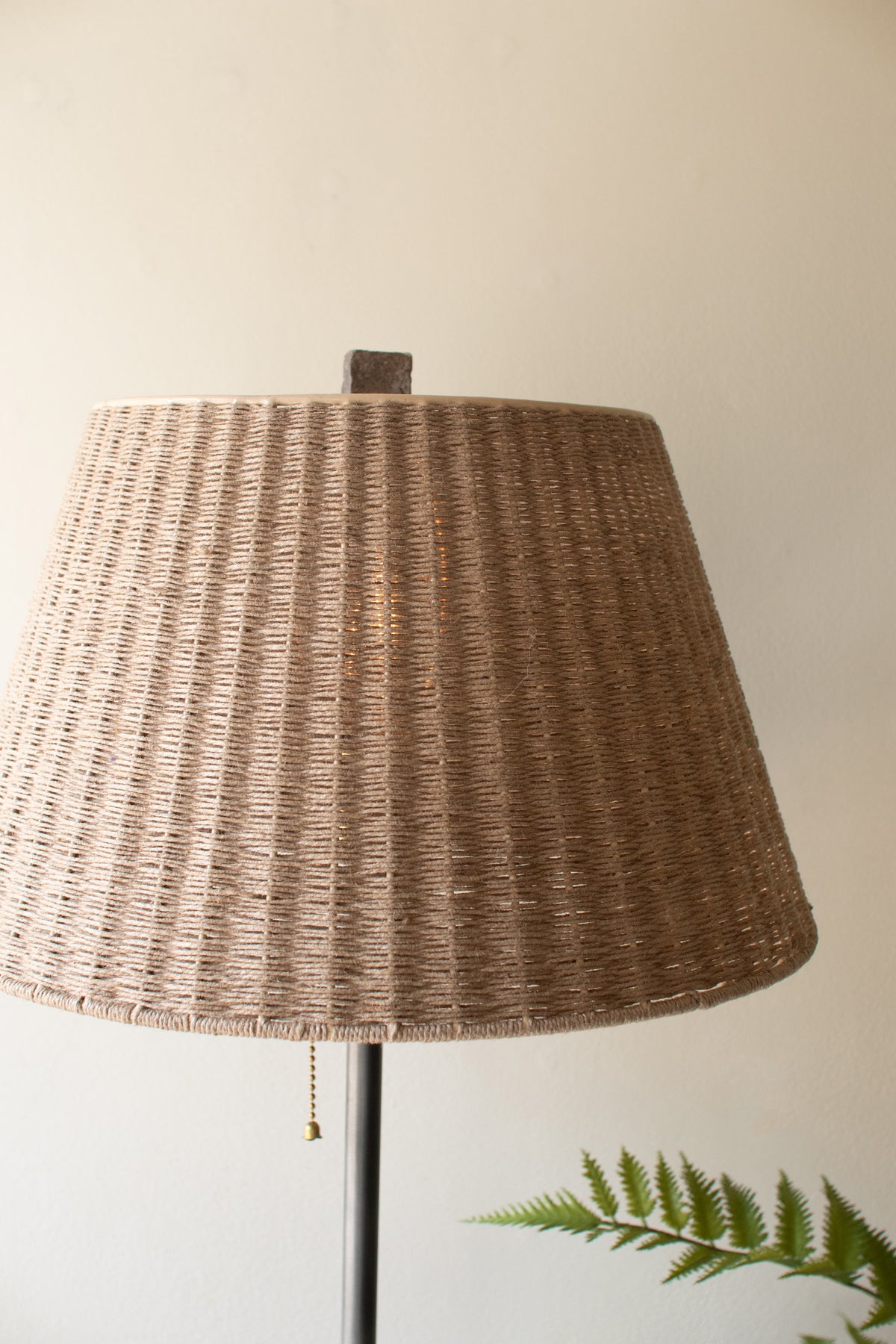 This table lamp with a paper mache base and rattan shade is 36"tall. This lamp works for the floor or tabletop and is neutral enough to go anywhere. It is made in India.