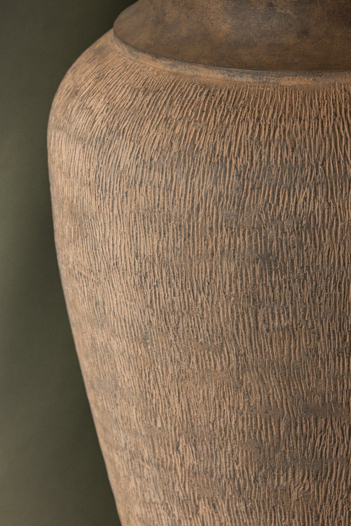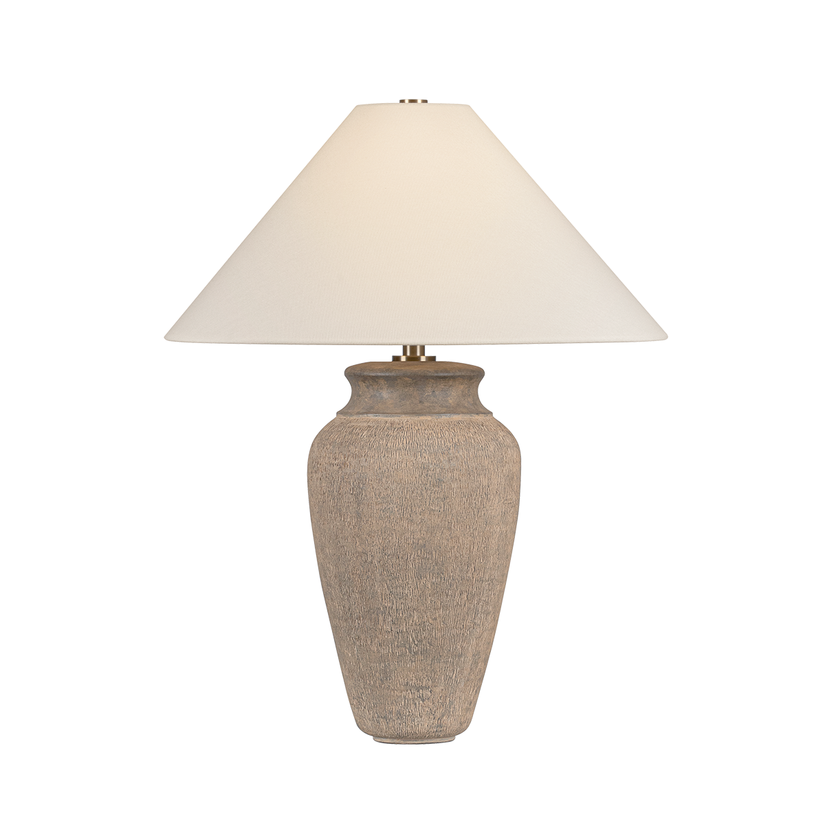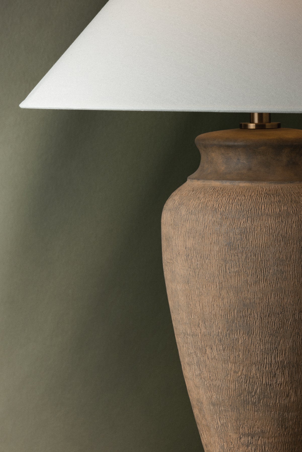 Inspired by Ancient Roman pottery, Vessel features a statuesque, elongated base with a richly textured finish that evokes clay layered by hand. A sharply tapered white linen shade balances the earthy hues with a note of freshness while Patina Brass hardware adds a subtle glint at the neck. Earthy yet refined, Vessel pairs beautifully with Unearthed for a collected, sculptural feel.