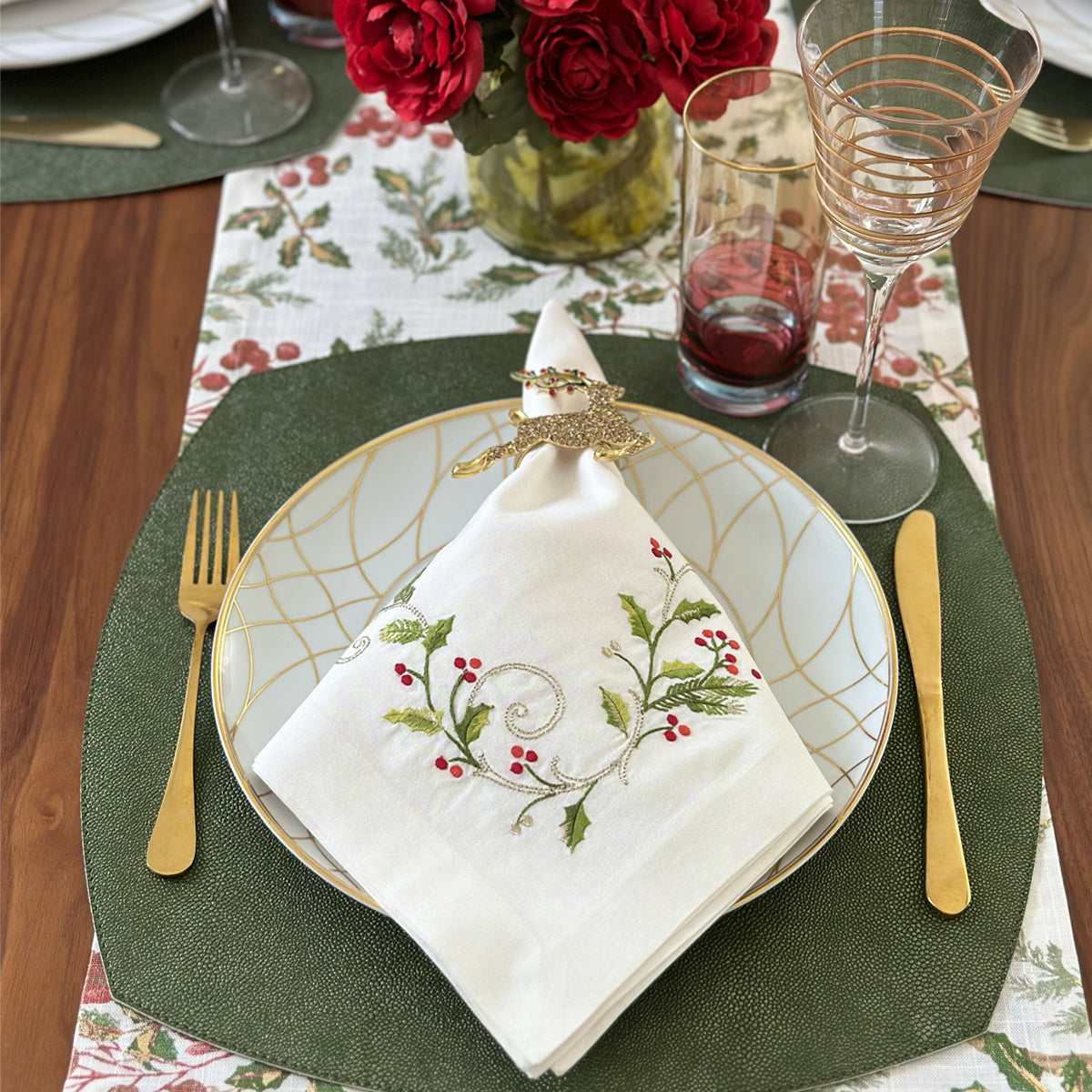 Add an elegant winter charm to your table with our Winterberry holiday napkins. Each napkin is meticulously embroidered by hand, featuring a delicate corner motif of holly leaves, ruby-red berries, and soft spruce needles. This artisan craftsmanship brings a vintage-inspired beauty and refined style to every holiday tablescape.