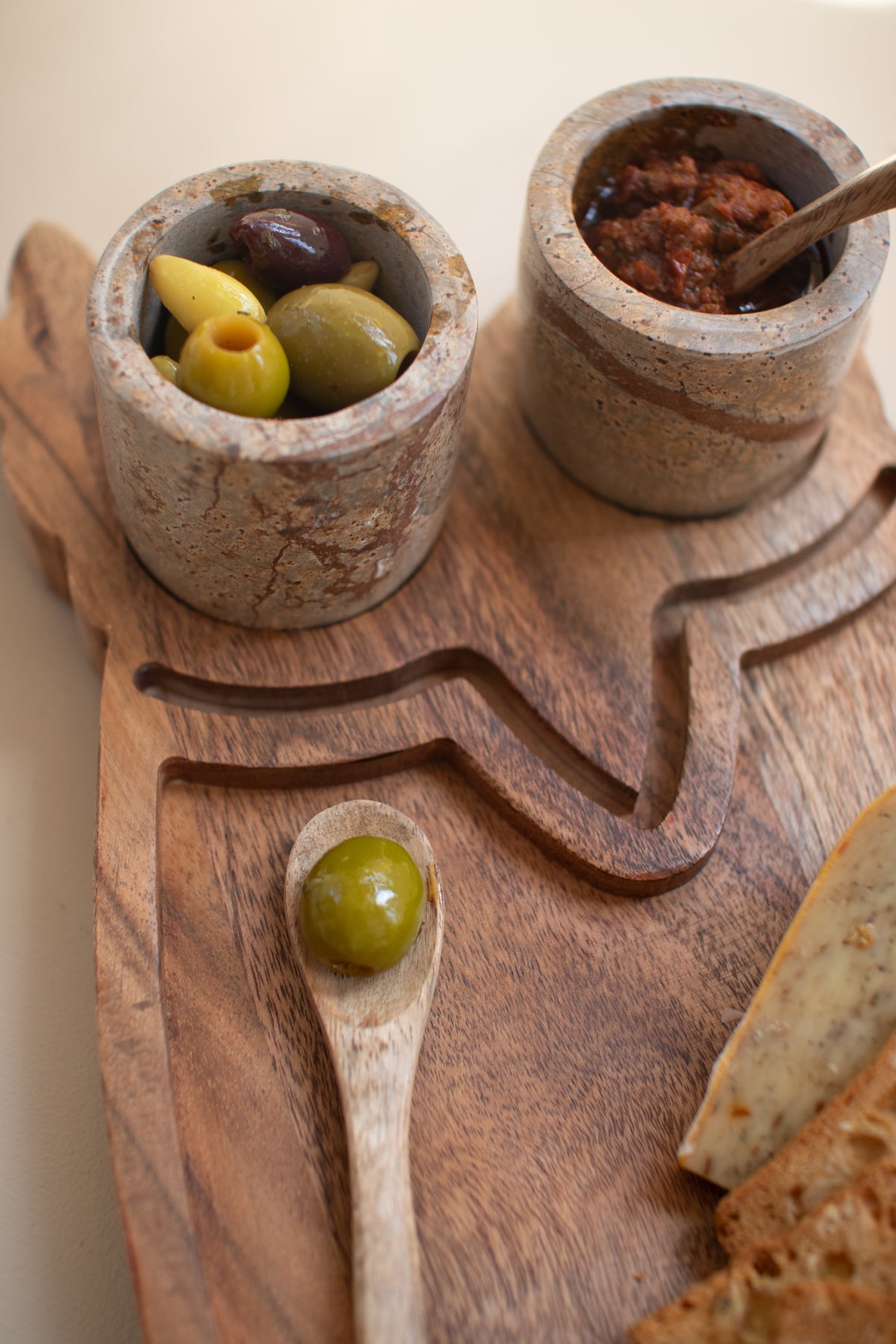 - Set includes 1 board, 2 marble bowls and 2 wooden spoons.