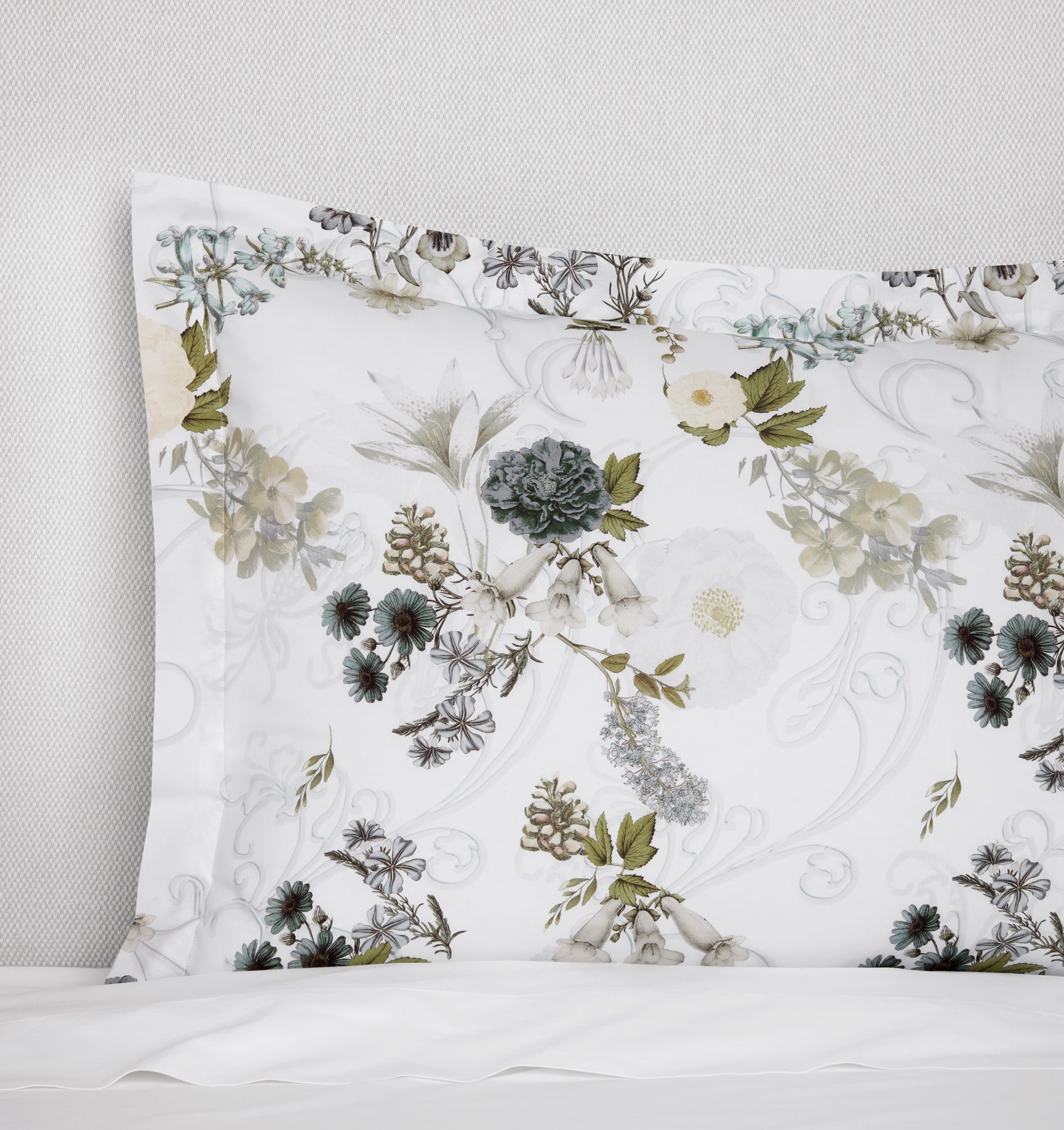 There’s a hush to Incanto, as if the flowers themselves are mid-whisper. Printed on smooth Italian percale, its delicate botanicals bloom in soft, painterly strokes—each petal and leaf rendered in shades of blue, green, and ivory that feel gathered from a dream. The composition is airy yet intentional, a careful arrangement that brings the calm of a garden indoors..