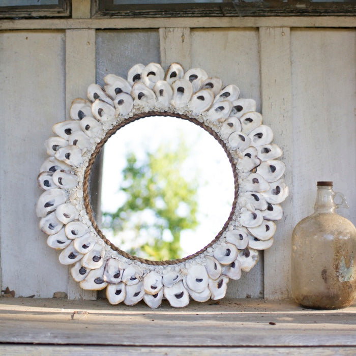 Bring a bit of the ocean home with this large round oyster shell mirror! A sophisticated way to add a coastal element to your home, each mirror is handmade and looks beautiful on its own or stunning in a group.