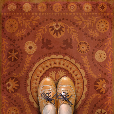 Inspired by old floor cloths and vintage linoleum, these vibrant vinyl rugs offer warm colors with beautiful aging. They are extremely durable, flexible, and also very easy to clean with a non-stick surface. Great in kitchens, playrooms, hallways, and offices.